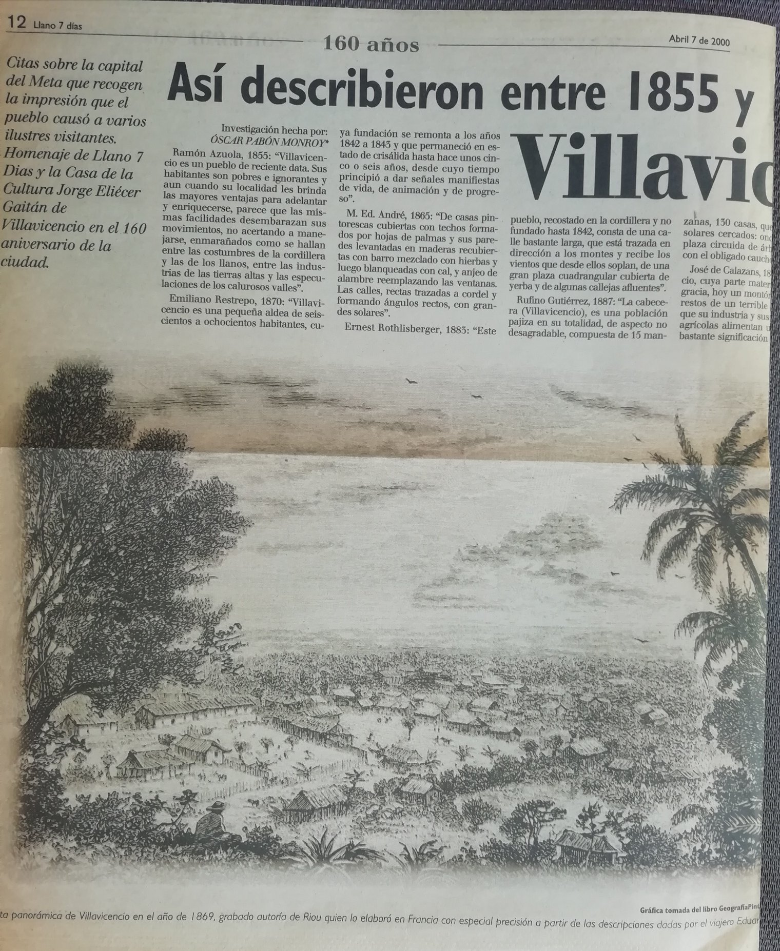 José Eustasio Rivera, 1916: “Más allá de Villavicencio, población importante de calles empedradas, de luz eléctrica y acueducto, se extiende una selva de más de 30 kilómetros de anchura, que va desde los ejidos de la población hasta el linde de los pajonales pequeños”.