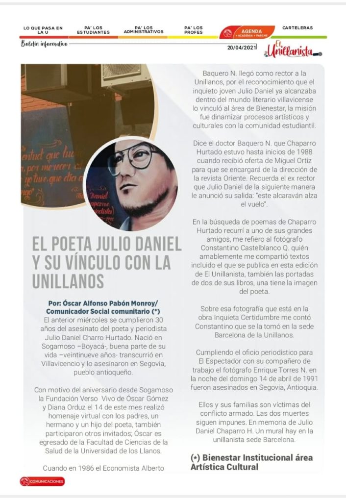 Por: Óscar Alfonso Pabón Monroy/ Comunicador Social comunitario (*) El anterior miércoles se cumplieron 30 años del asesinato del poeta y periodista Julio Daniel Chaparro Hurtado. Nació en Sogamoso –Boyacá-, buena parte de su vida –veintinueve años- transcurrió en Villavicencio y lo asesinaron en Segovia, pueblo antioqueño.