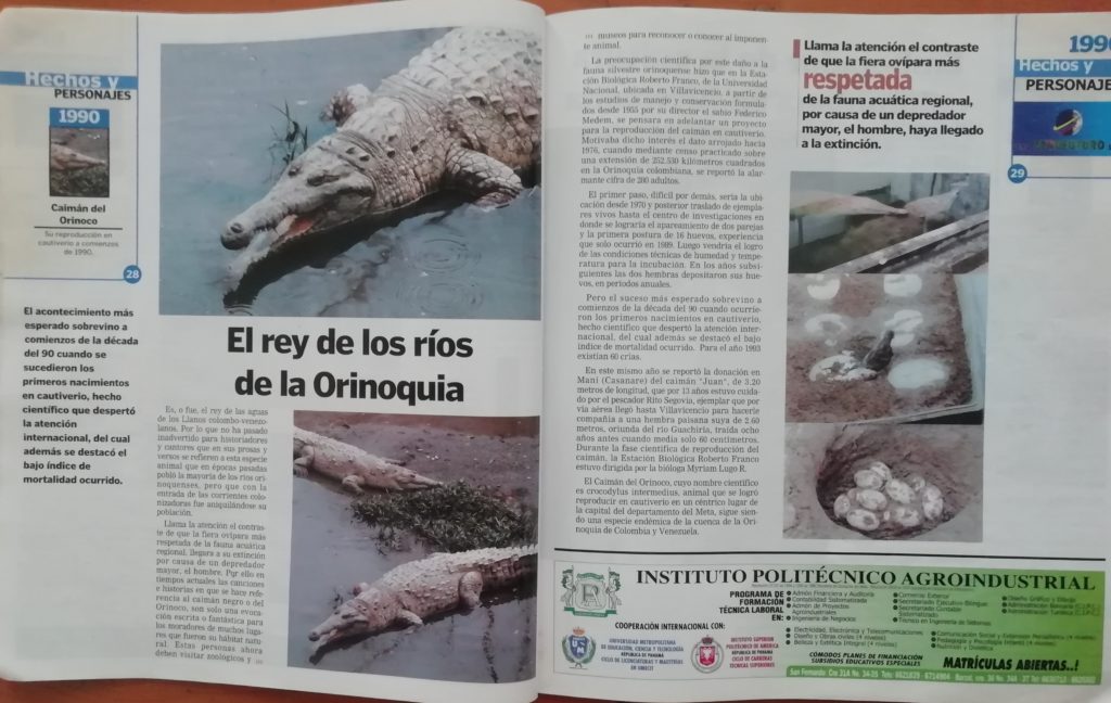 Para la publicación Hechos y Personajes del Llano, editada por Llano 7 días, en el año 2004 entrevisté a la Bióloga Miriam Lugo R. quien me contó detalles de los momentos anteriores y posteriores a los primeros nacimientos en cautiverio del caimán llanero en Villavicencio, también me facilitó fotografías. A esa crónica la titulé El rey de los ríos de la Orinoquia.