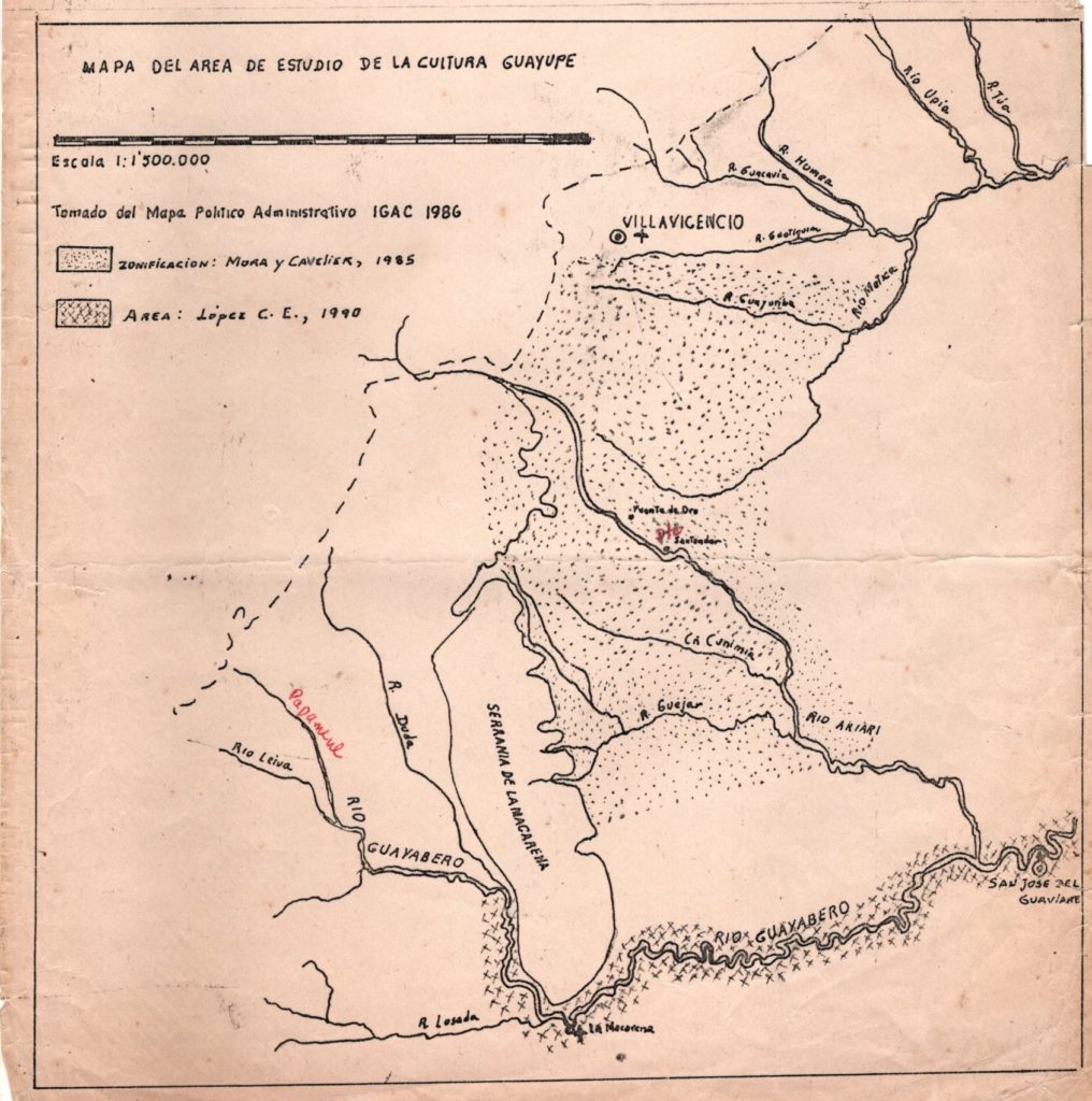 En 1990 la antropóloga Elizabeth López C. elaboró este mapa con la distribución de trabajos arqueológicos en la macro nación Guayupe de ella y de Inés Cavelier con Santiago Mora.