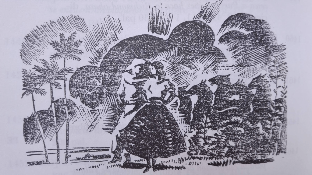 La ilustración -sin autor- con pareja de baile, palmeras, rayos de sol, horizonte plano, nubes y tropel de equinos sirvió para ambientar el artículo Alabanza al Llano del literato Eduardo Carranza F. Los dos trabajos fueron publicados por El Tiempo el 3 de enero de 1943.